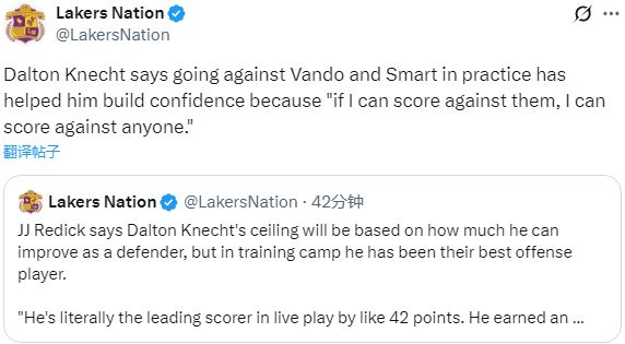 24岁的克内克特终于迎来反弹,湖人记者Dan Woike表示:对道尔顿-克内克特来说,这是一次找回进攻节奏的不错表现。听说他在训练营的进攻表现就非常强势,今晚算是把训练场上的状态带到了赛场上。