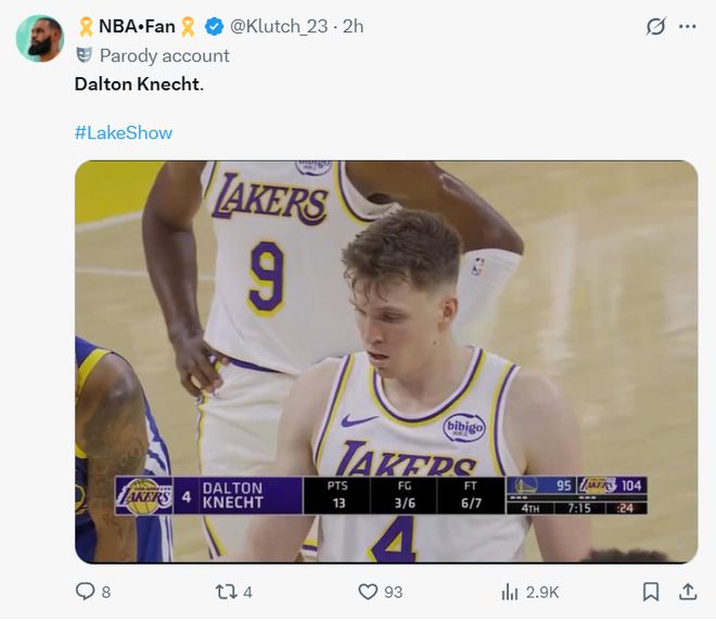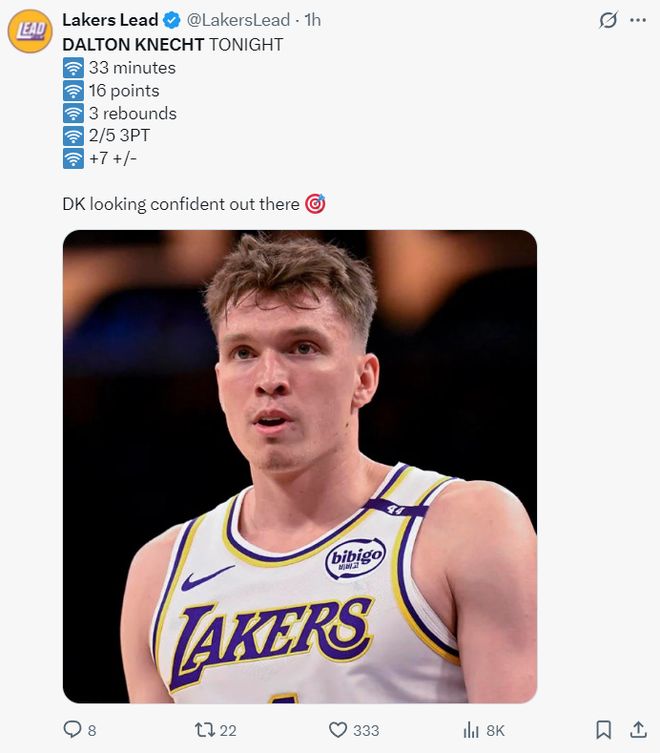 北京时间10月13日,湖人击败勇士的季前赛,道尔顿-克内克特是先发二号位,这场比赛克内克特一扫阴霾得分上双,此前两场比赛克内克特合计21中5+三分14中3,他甚至被多支球队视为负资产,不少GM认为湖人送走他需要搭上一些优质资产才行。