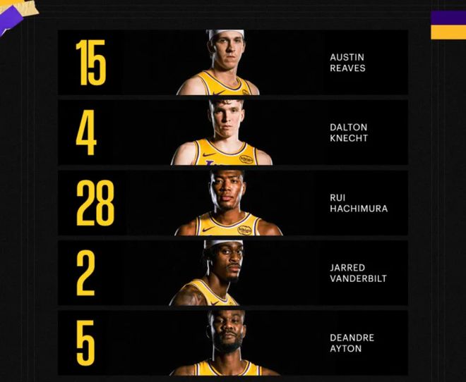 今天比赛,首发阵容方面,勇士队这边,科尔排出的首发五人组为:布兰丁--波杰姆斯基、巴迪-希尔德、乔纳森-库明加、德雷蒙德-格林、昆滕-波斯特;湖人队这边,首发阵容则为:奥斯汀-里夫斯、多尔顿-克内克特、八村垒、贾里德-范德比尔特、德安德烈-艾顿。