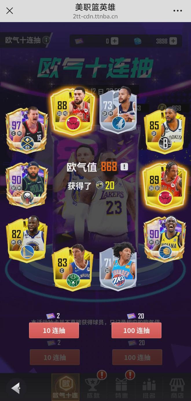 全新活动!NBA英雄2欧气十连抽来啦 一次你就有机会登上欧气or厄运榜一 保住排名就能将94铂金自选卡拿下 约老师还是库里老詹?顶级球星全任选