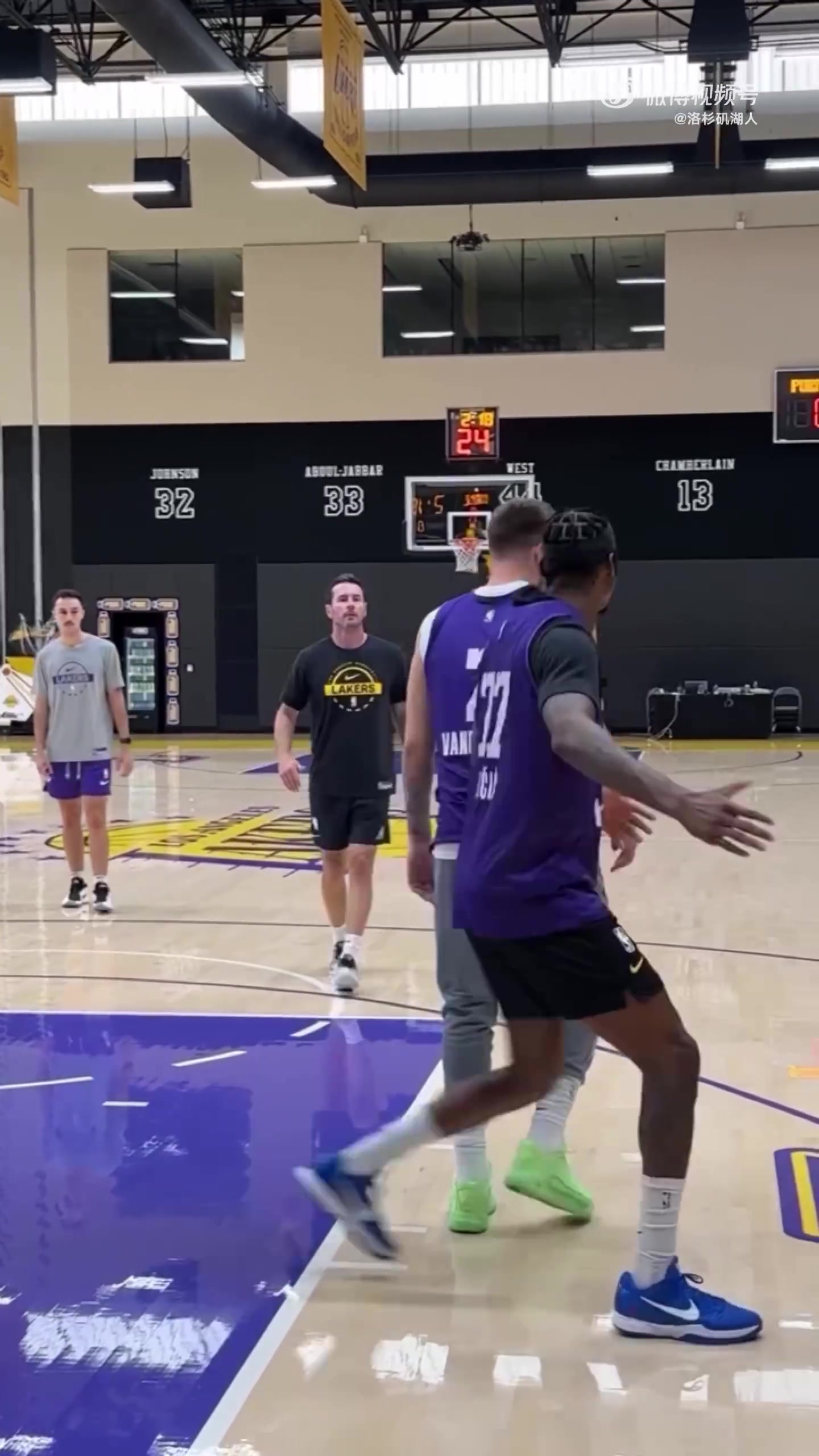 足球比分网10月14日讯 湖人官方社媒更新,分享队内训练最新动态。 视频当中,东契奇和范德比尔特互换球衣,两人各自身穿对方的球衣进行训练。