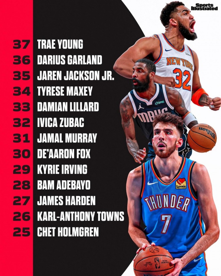 足球比分网10月10日讯 近日,美媒《体育画报》排出了新赛季Top50-11的球员,详情入下: 50-41:贝恩、戈贝尔、阿门、希罗、德里克-怀特、阿努诺比、莫兰特、杰伦-约翰逊、小瓦格纳、阿隆-戈登 40-31:锡安、小萨博尼斯、申京、特雷-杨、加兰、JJJ、马克西、利拉德、祖巴茨、贾马尔-穆雷 30-21:福克斯、欧文、阿德巴约、哈登、唐斯、霍姆格伦、西亚卡姆、巴特勒、布克、班凯罗 20-11:杰伦-威廉姆斯、莫布里、杰伦-布朗、恩比德、哈利伯顿、杜兰特、莱昂纳德、浓眉、布伦森、库里