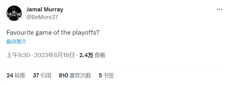 冠军后卫 时间: 2025-10-15 来源: 网络 作者: admin 足球比分网6月19日讯 贾马尔-穆雷今日发推。冠军后卫推特发问:“最喜欢的季后赛比赛是?” 上一篇:键盘侠| 下一篇:穆雷:我生涯的前17投全铁 一度让我怀疑自己是