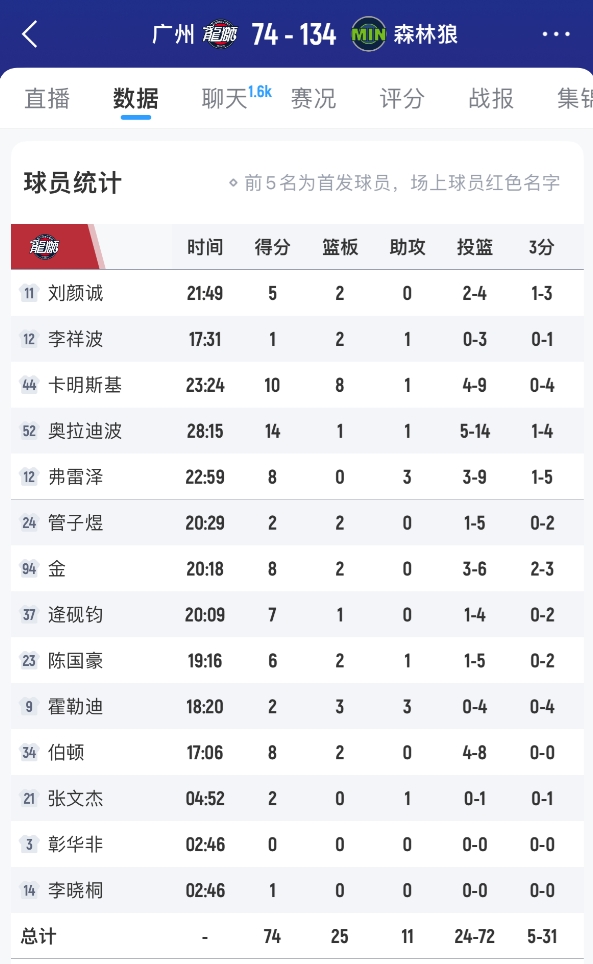 足球比分网10月14日讯 NBA季前赛,广州74-134不敌二阵森林狼。全场广州净负60分,为其今年三场NBA季前赛输球最大分差。 另外值得一提的是,本场比赛广州上了14名球员,6名外援+8名国内球员,8名国内球员合计进了5个运动战进球。 其中刘颜诚4中2拿到5分,管子煜5中1得到2分,逄砚钧4中1得到7分,陈国豪5中1得到6分。 |