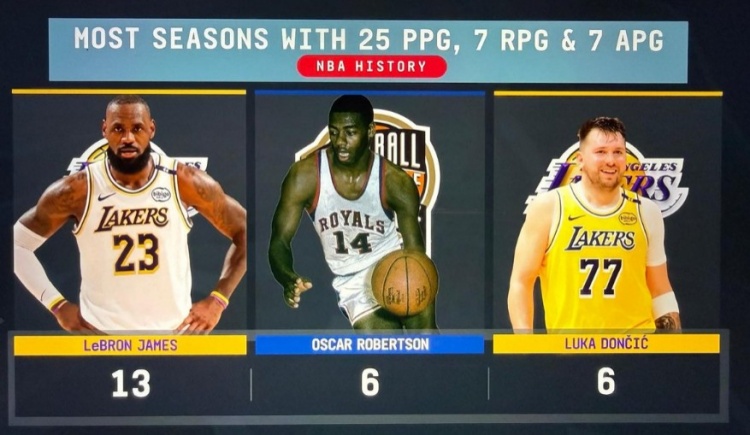 单赛季场均25+7+7场次:詹姆斯13次历史最多 东契