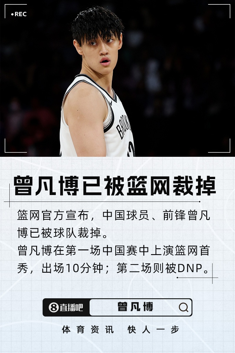 足球比分网10月15日讯 篮网官方宣布,中国球员、前锋曾凡博已被球队裁掉。 此前,曾凡博和篮网签下的是一份Exhibit 10合同,在被裁员之后可以前往篮网的G联盟球队长岛篮网打球。 此前北京首钢给曾凡博进行了预注册,他可以选择回CBA征战,今年CBA联赛将于12月份开打。 今年NBA中国赛第一战,曾凡博上演篮网生涯首秀,他替补上阵10分06秒没有出手、没有得分,有1次抢断和3个犯规进账;中国赛第二场,曾凡博没有得到出场机会。 2025年休赛期流言+官宣汇总 |