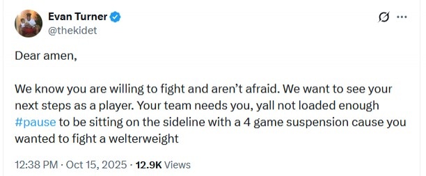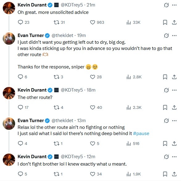 足球比分网10月15日讯 NBA季前赛,火箭130-128险胜鹈鹕。 比赛中阿门和阿尔瓦拉多爆发肢体冲突,前NBA球员埃文-特纳在网上展开评论,不料杜兰特提着键盘前来维护队友,双方展开了一轮对线。具体内容如下: 特纳:亲爱的阿门,知道你能打也从不怯场。但球队需要看到你的进阶成长。阵容深度本就不够,难道你想因为打一场羽量级格斗而被禁赛四场吗? 杜兰特:好极了,又是一堆不请自来的建议。 特纳:只是不想看你孤立无援,大兄弟。提前帮你发声,免得你走上另一条道路。 杜兰特:另一条路?(The other route?) 特纳:放松啦哈哈, 又不是指干架或者其它啥的。随口说说而已,别过度解读哦。 杜兰特:我不打架兄弟哈哈,你在说啥我心知肚明。