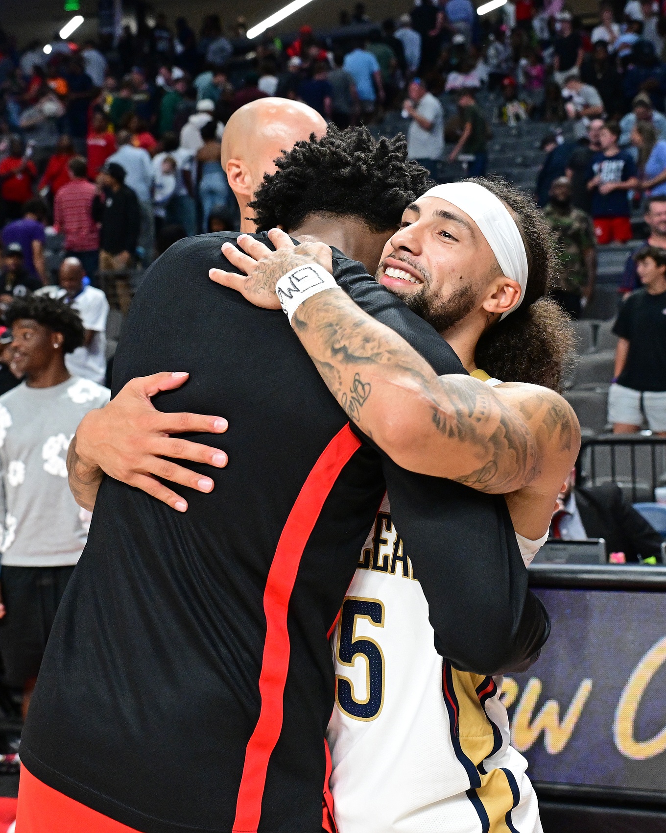 足球比分网10月15日讯 NBA季前赛,火箭130-128险胜鹈鹕。 在本场比赛中,阿门-汤普森和阿尔瓦拉多因为卡位问题爆发了冲突,不过,他们两人在赛后拥抱,握手言和。 相关阅读: