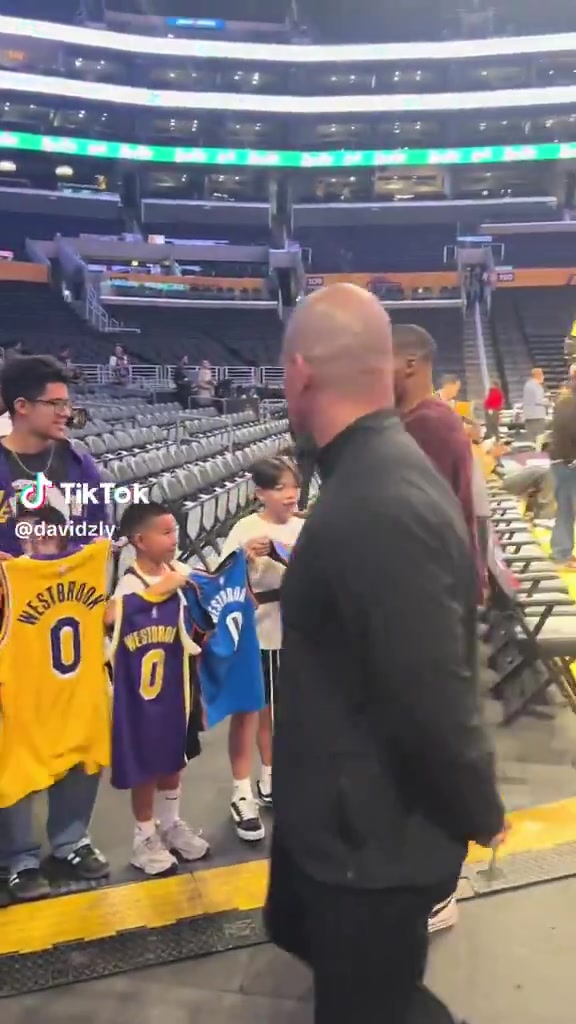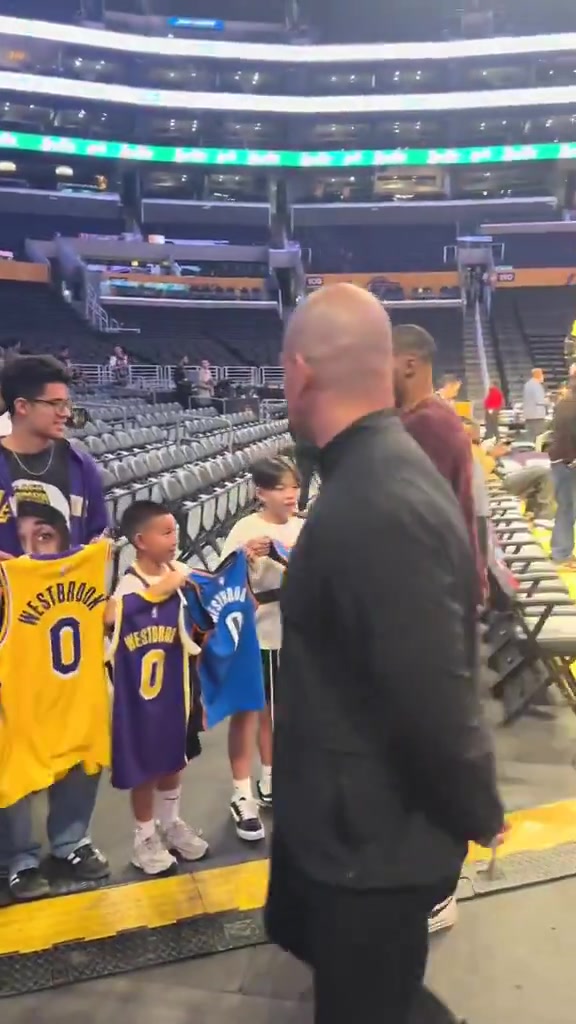 球迷上传的完整版视频里,威少确实没有给湖人球衣签名,但他把自己的腕带送给了手持湖人球衣的小球迷。