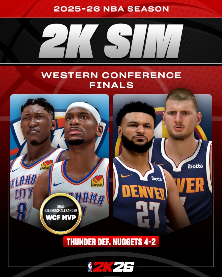 足球比分网10月18日讯 NBA 2K26官方社媒更新动态,晒出了他们模拟预测的新赛季东西决对阵双方。 详细对阵为: 西决:掘金VS雷霆; 东决:骑士VS尼克斯。