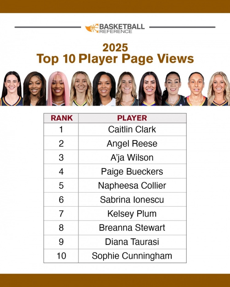 数据网站公布本赛季WNBA球员浏览量排行:克拉克