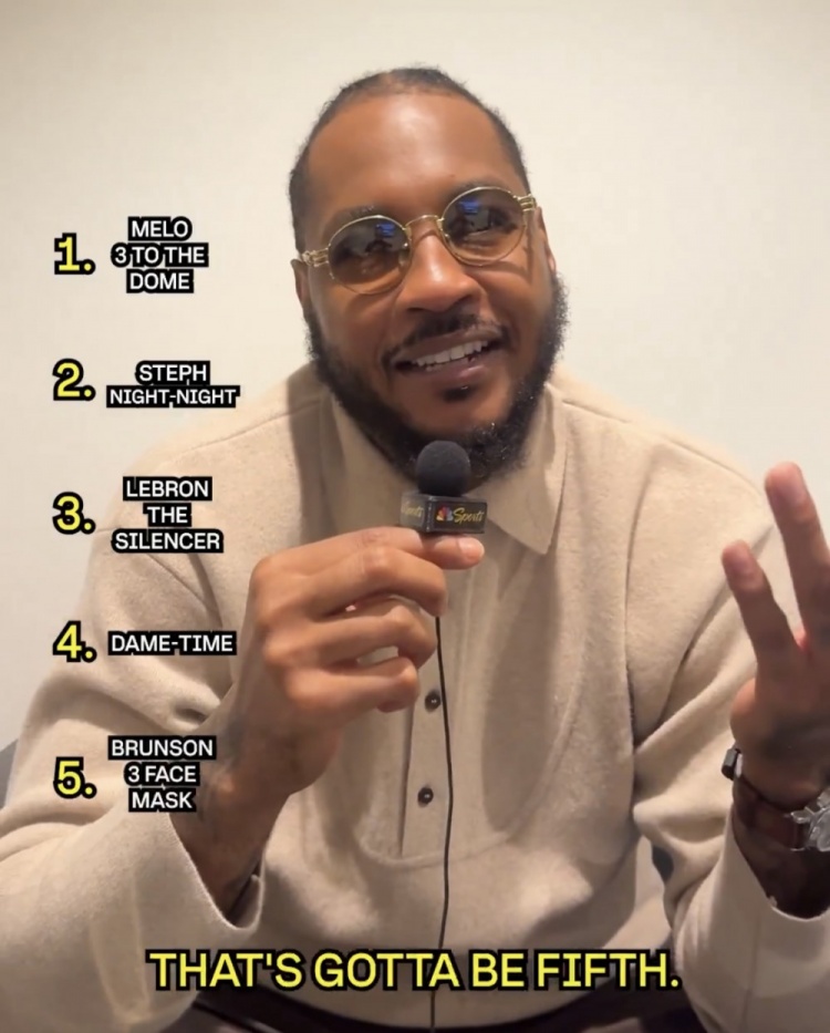 足球比分网10月20日讯 今日,NBC on NBA官推晒出一段NBA名宿安东尼的趣味采访。 安东尼对记者提出的五大标志性庆祝动作排序: 1. 甜瓜三分(三根手指顶向太阳穴) 2. 库里晚安 3. 詹姆斯消音器(抬腿双手下压,随后拍胸口) 4. 利拉德时间(抬腕看表) 5. 布伦森三分蒙面
