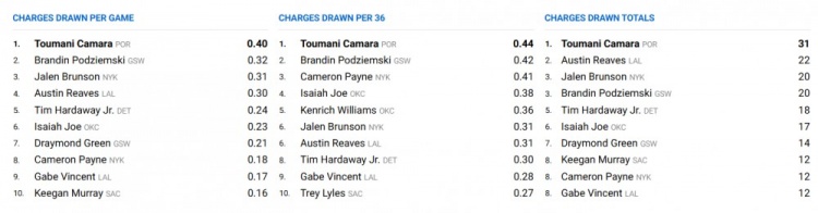 卡马拉上赛季造对手91次进攻犯规&包括31次带球撞