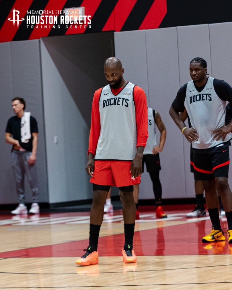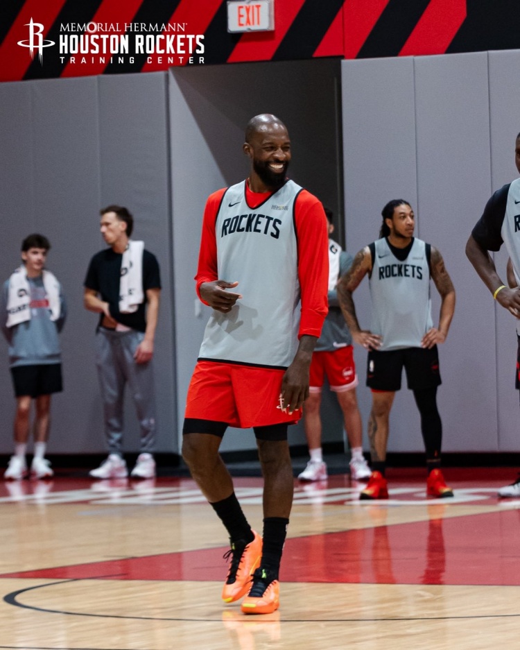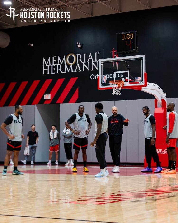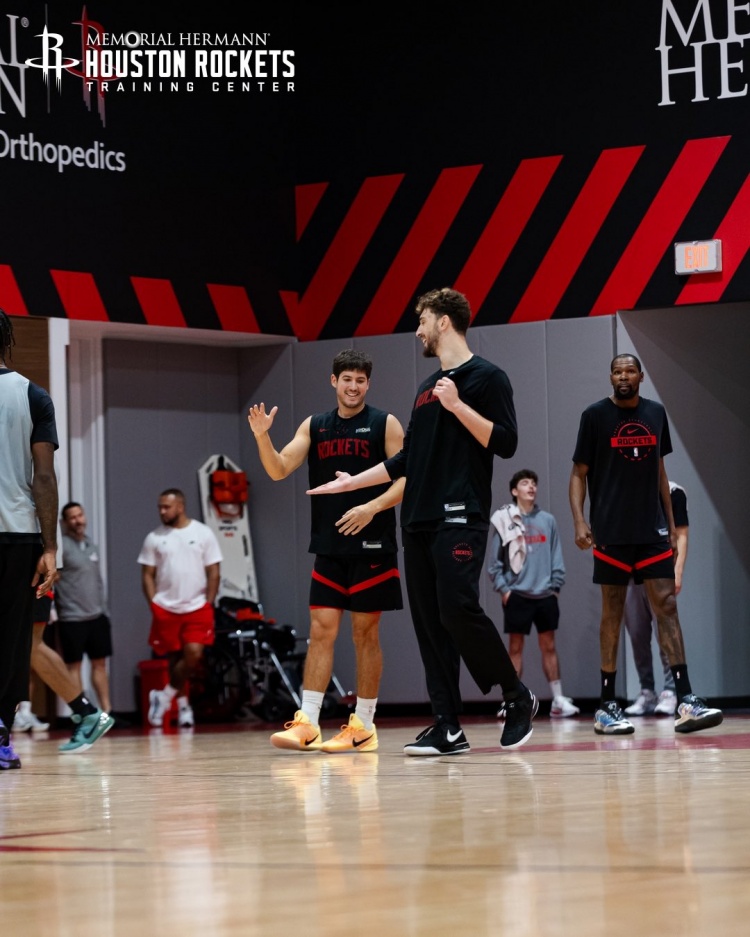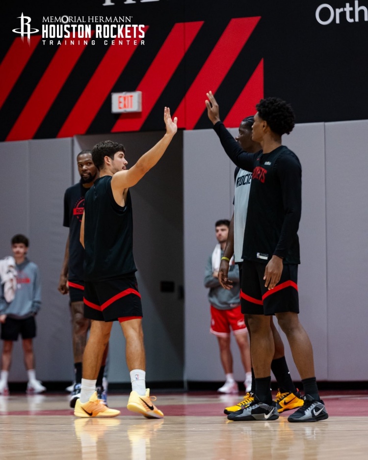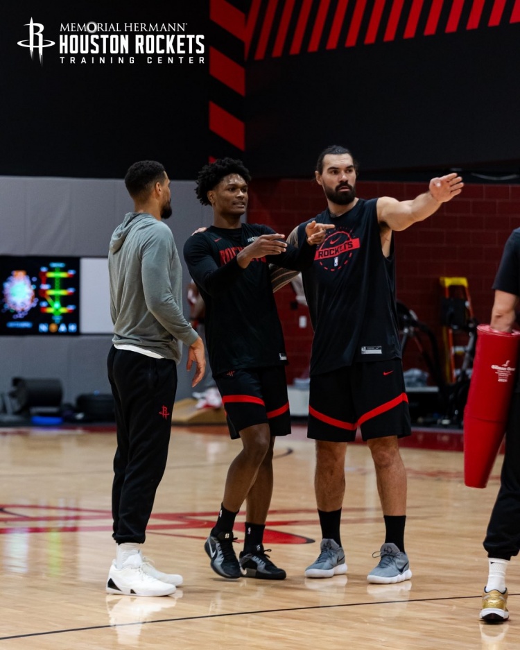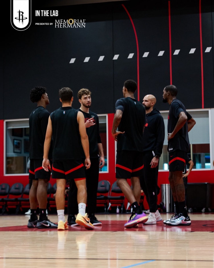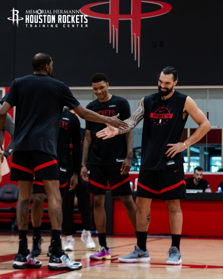 火箭晒训练照:“五高”阵容交流 杜兰特亚当斯