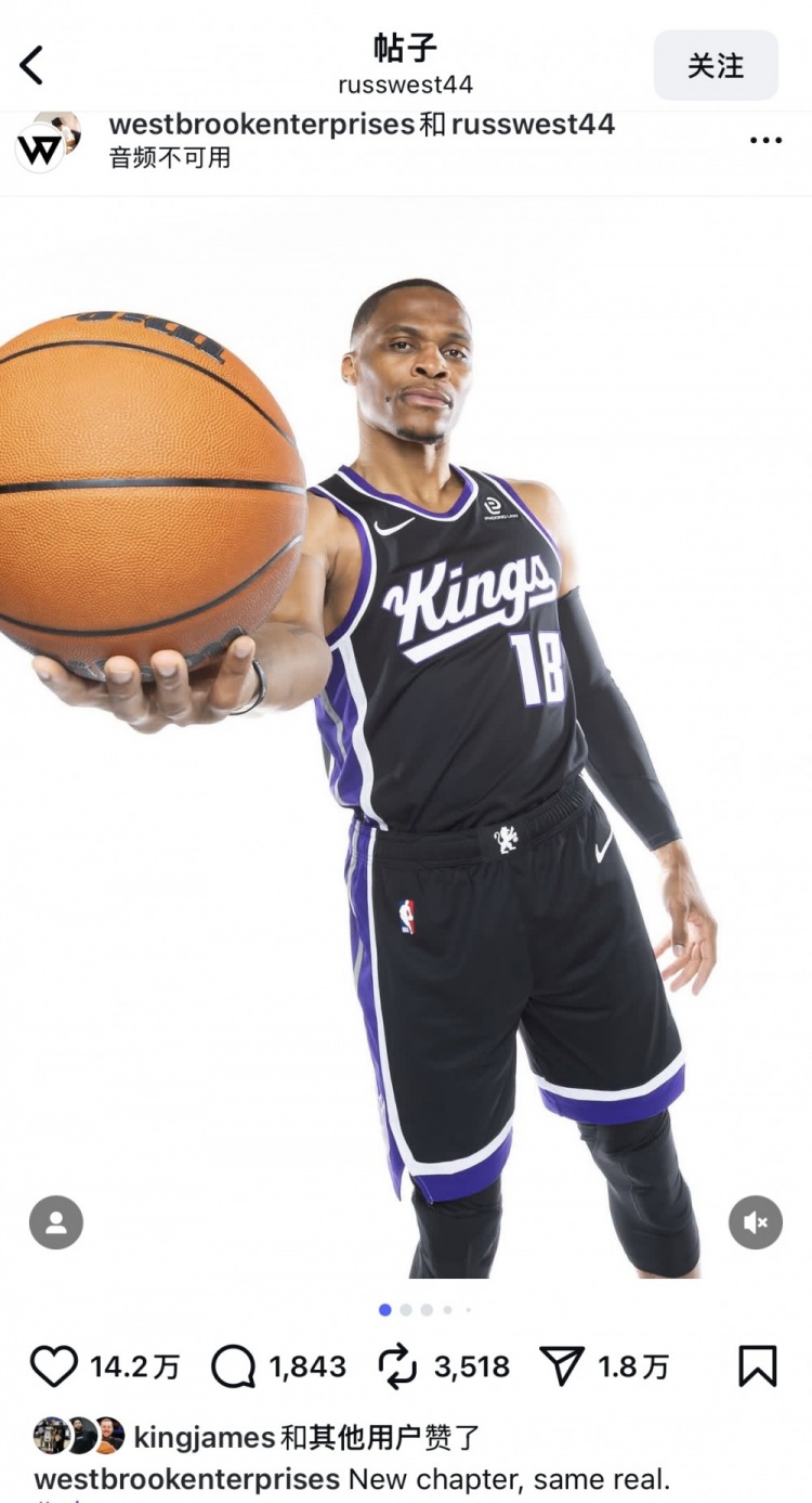 足球比分网10月21日讯 今日,国王后卫威斯布鲁克更新了Instagram,转发了一组自己的新赛季定妆照。 值得一提的是,湖人前锋詹姆斯也对此贴点赞。