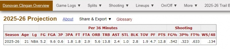 足球比分网10月21日讯 近日数据网站Basketball-Reference预测了开拓者中锋克林根新赛季的数据,每36分钟内拿12.8分13.8板(5.6前场板)2.4助2.8帽,三项命中率为54.2%、32.3%和63.3%。