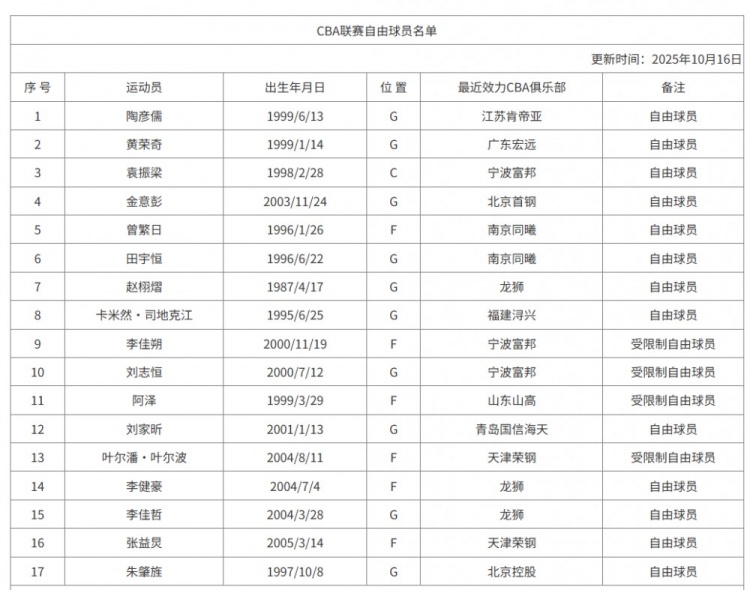 足球比分网10月21日讯 昨日CBA官方公布2025-26赛季赛程,新赛季将于12月12日开打。 相关消息人士对足球比分网记者透露,2025-2026赛季CBA第一个国内球员交易窗口期将于2025年11月16日至22日开启,在这期间可以进行自由球员认领和国内球员互换。 在最新的CBA联赛自由球员名单中,黄荣奇、曾繁日、阿泽等人在列,但根据此前的报道,同曦已签下黄荣奇,吉林已签下曾繁日。