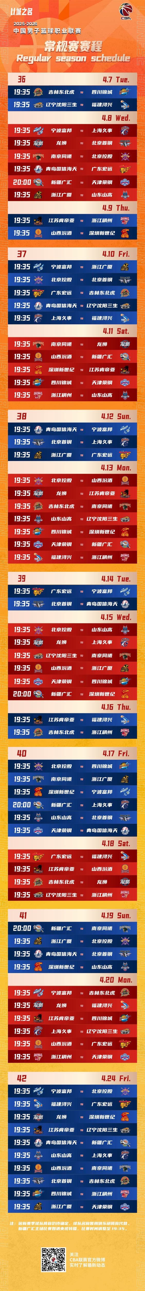 20日晚,CBA联赛公司对外公布了CBA2025-26赛季的赛程。由于今年有全运会比赛,因而新赛季CBA开始时间推迟到12月12日开始,揭幕战是卫冕冠军浙江广厦队与上赛季最大黑马山西队之间的交锋。北汽男篮、北控男篮的首场比赛都是在13日,北控对阵山东;北汽对阵江苏。 与此前赛季相比,新赛季开始时间“延后”了快两个月时间,这使得新赛季的常规赛轮次缩短到42轮。上赛季球队根据蛇形排位,最终确定了分组形式。每支球队将与同组对手交锋三次,与非同组对手交锋两次。北汽男篮被分在B组,同组对手包括青岛、浙江、广州、福建。北控男篮被分在A组,同组对手包括广厦、山东、天津、宁波。 20日联赛公司公布了新赛季的具体赛程,揭幕战由广厦对阵山西,这场比赛必定十分精彩。12月31日元旦大战也安排了有故事的对决:辽宁与上海,这将是张镇麟在今年夏天转会至上海后,首次回到辽宁主场。另外1月13日,将迎来首次的辽粤对决。虽然辽宁在新赛季的整体实力下降,他们已经不再是像此前那样是联赛的夺冠热门球队,但辽宁与广东的对决仍然看点十足。 北汽男篮的首场比赛是13日客场挑战江苏队,他们的首个主场是15日对阵新疆队。新赛季常规赛将在4月24日结束,北汽男篮的收官战是主场对阵吉林队。