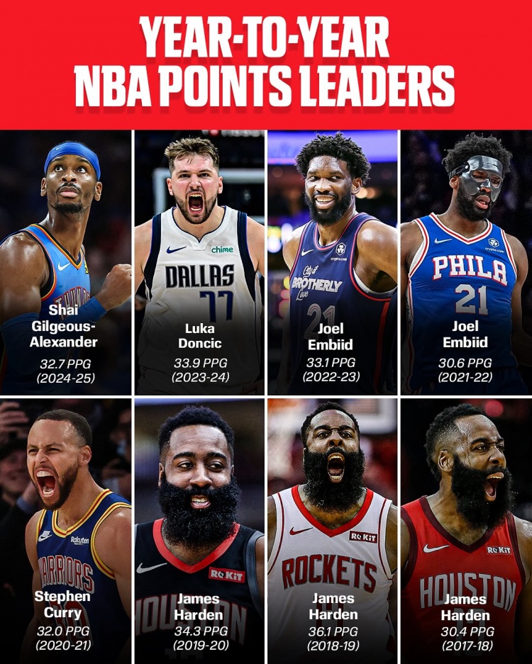 足球比分网10月22日讯 NBA ON ESPN统计,列出了NBA近16个赛季的NBA得分王,这16个赛季的得分王由八人包办。 详细名单: 2024-25:亚历山大 32.7分 2023-24:东契奇 33.9分 2022-23:恩比德 33.1分 2021-22:恩比德 30.6分 2020-21:库里 32.0分 2019-20:哈登 34.3分 2018-19:哈登 36.1分 2017-18:哈登 30.4分 2016-17:威少 31.6分 2015-16:库里 30.1分 2014-15:威少 28.1分 2013-14:杜兰特 32.0分 2012-13:安东尼 28.7分 2011-12:杜兰特 28.0分 2010-11:杜兰特 27.7分 2009-10:杜兰特 30.1分