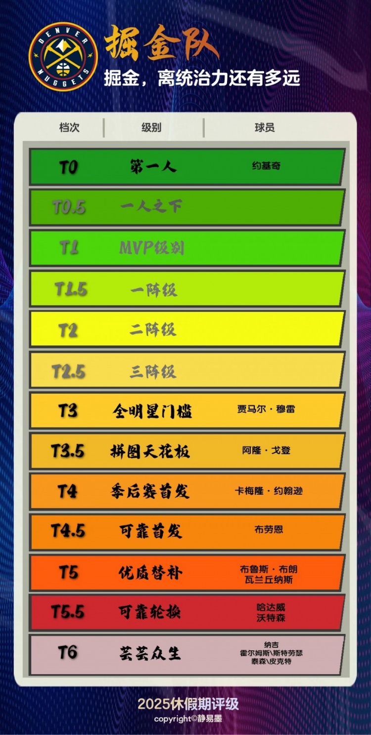 约基奇作为内线终结点终归不同于传统外线核心,“合适位置接球快速解决问题”对一个内线来说是最自然的进攻定位,约基奇可以朝这边丝滑靠拢,这让威少感觉舒适。24-25赛季,SGA做到了历史上少数伟大名字才能在一年之内集齐的顶级荣誉,但这竟然丝毫没有动摇约基奇在人们心中第一人的位置,对此每个人都可以找到合理的解释。在我这里,进一步证明兼容于不同类型球员这件事是加分项。当然了,非要说的话,约基奇也不能兼容所有人,不能证明可以搭档另一个大中锋算一个。这听起来好像不讲道理,但相比后卫、前锋核心,中锋核心这个缺陷的影响是实打实的,这一点在去年的评级系列有过讨论,不再赘述。 掘金在争冠组里面。在常规赛就展现这样的实力,还是到了压榨战力的季后赛展现,需要手里这几笔补强的效果来验证。掘金一直在证明他们的韧性,或者说,必然要在第四节中后段登场实力特别强大的阵容(首发替补实力差别大又强化了这件事),让掘金可以在最后10分钟“大火收汁”。这支球队的生命值被压入斩杀线后,他们的比赛才刚刚开始。 这很伟大,但掘金最好不要把这样的特征看做争冠的法宝。23夺冠,就算配有西决连续逆转的戏剧张力,他们的硬核统治力也是充裕的,而现在他们之于联盟还没有这种自信。 增量在哪呢?赛季中的交易? 那还远。 非要说的话,还真是这个似乎签贵了的布劳恩。掘金这几年指望从板凳末掘金的尝试几乎都失败了,布劳恩差不多成了自研成果的独苗。我一开始甚至给他放在了T4,降半档更符合一般印象,并不排除开赛一段时间后调档的可能性。布劳恩要努力证明自己,这不但关系到掘管的脸面和智商,也实打实关系到掘金是什么段位的球队。 毕竟,如果一支球队5个首发真的都值2000万以上,还拥有联盟第1人,这样的球队想想都挺吓人的。