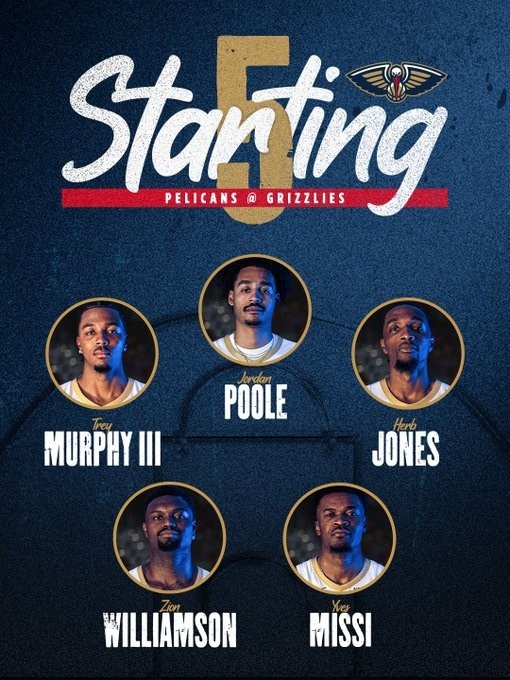 足球比分网10月23日讯 鹈鹕新赛季揭幕战对阵灰熊,赛前首发阵容出炉: 普尔、墨菲、琼斯、锡安、米西。 据记者Jim Eichenhofer报道,这是墨菲、琼斯和锡安18个月来首次合体出战比赛。 |