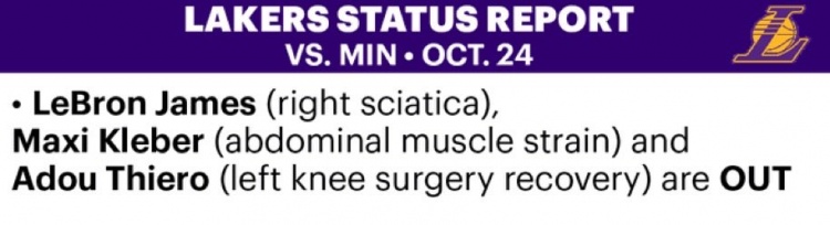 足球比分网10月24日讯 今日,湖人官方发布了明日比赛的伤病报告。 詹姆斯(右侧坐骨神经痛)、马克西-克莱伯(腹部肌肉拉伤)、阿杜-蒂耶罗(左膝手术恢复)缺席比赛。