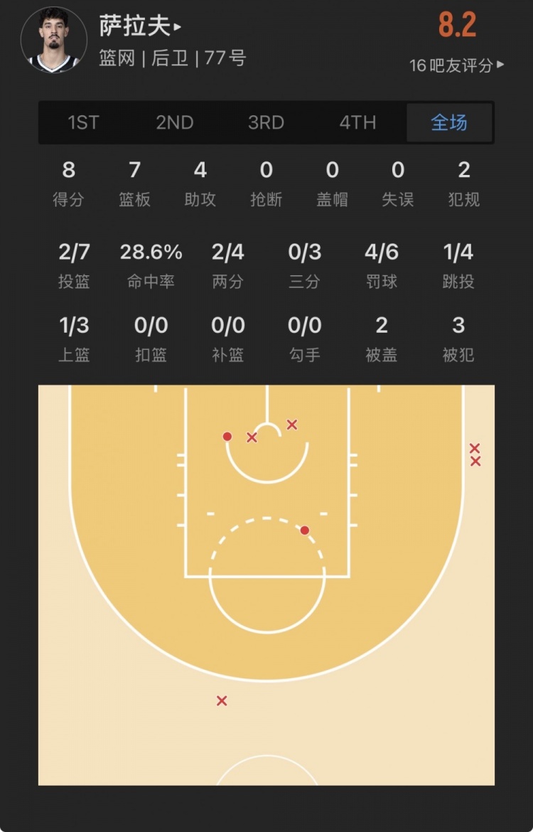 篮网26号秀 本-萨拉夫 登场20.0分钟