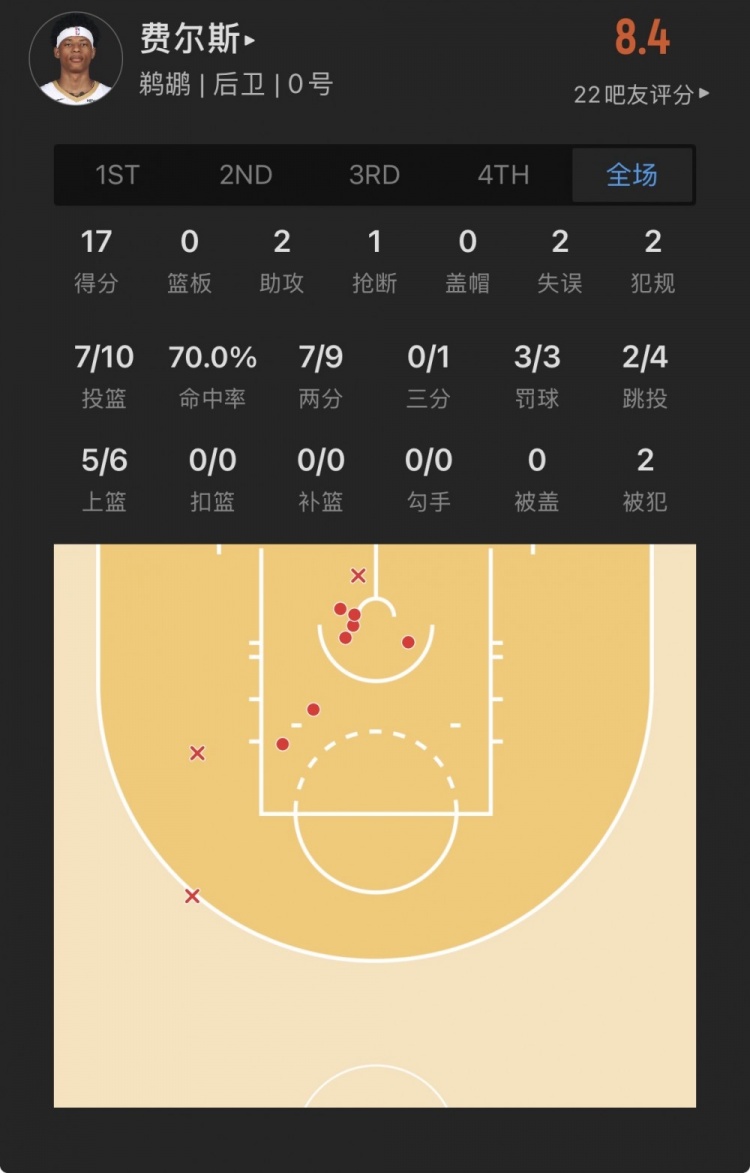 鹈鹕7号秀 杰里迈亚-费尔斯 登场18.3分钟