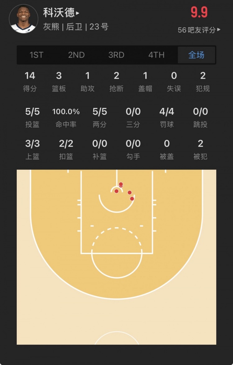 灰熊11号秀 锡德里克-科沃德 登场22.2分钟