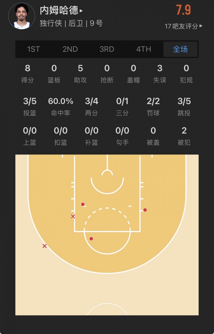 独行侠落选秀 瑞安-内姆哈德 登场15.5分钟