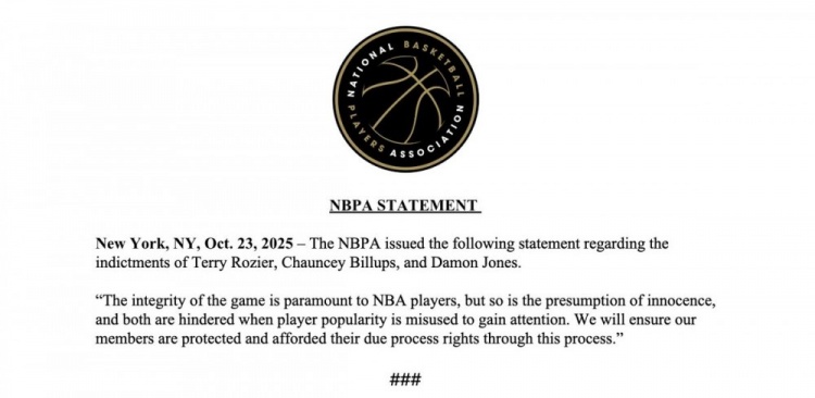 足球比分网10月24日讯 据此前报道,开拓者主帅比卢普斯、热火球员罗齐尔因参与非法赌博被FBI逮捕。 NBA球员工会发表声明如下:“比赛公正性对NBA球员至关重要,但无罪推定原则同样不容践踏。当球员声望被滥用以博取关注时,这两大基石都将遭到破坏。我们将确保会员在此过程中获得应有保护,并享有正当程序权利。”