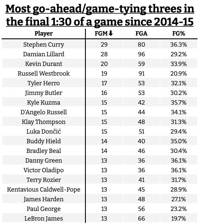 足球比分网10月24日讯 NBA常规赛,掘金在客场以131-137不敌勇士。 常规时间最后时刻,库里在剩余21秒时轰进一记将比赛拖入加时的超超远三分。 数据网站统计,自2014-15赛季以来,最后1分30秒的追平&反超三分,库里已经轰进第29记,超越利拉德,独占第一。 具体榜单如下: 1、库里 80投29中 命中率36.3% 2、利拉德 96投28中 命中率29.2% 3、杜兰特 59投20中 命中率33.9% 4、威少 91投19中 命中率20.9% 5、希罗 53投17中 命中率32.1% 6、巴特勒 53投16中 命中率30.2% 7、库兹马 42投15中 命中率35.7% 8、拉塞尔 44投15中 命中率34.1% 9、克莱 48投15中 命中率31.3% 10、东契奇 51投15中 命中率29.4% 11、希尔德 40投14中 命中率35% 12、比尔 46投14中 命中率30.4% 13、丹尼-格林 36投13中 命中率36.1% 14、奥拉迪波 36投13中 命中率36.1% 15、罗齐尔 41投13中 命中率31.7% 16、波普 45投13中 命中率28.9% 17、哈登 48投13中 命中率27.1% 18、乔治 56投13中 命中率23.2% 19、詹姆斯 66投13中 命中率19.7%