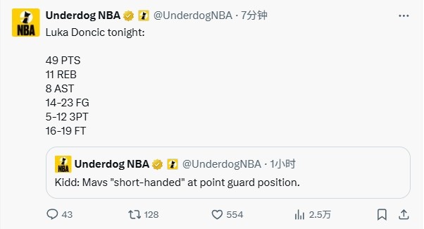 足球比分网10月25日讯 NBA常规赛湖人128-110森林狼,东契奇砍下49分11篮板8助攻。 在今天独行侠输给奇才赛后,基德说:“球队目前控卫人手短缺。” 美媒则晒出了东契奇本场的数据回复。