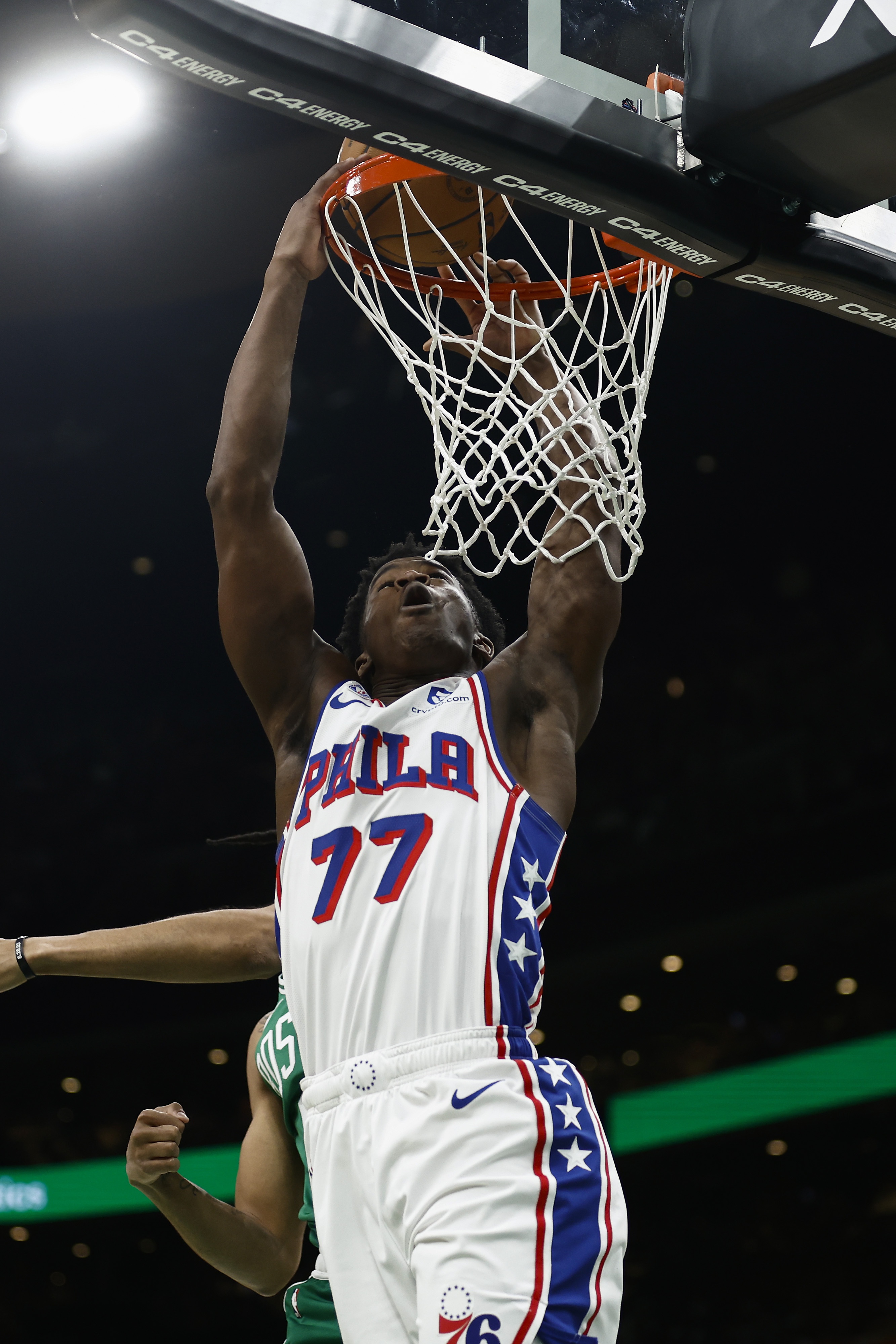 这位20岁的年轻人在第一节中段开始在比赛中留下自己的印记,他连续得到了10分。 他的首次运动战得分来自一次切入扣篮,当时距离首节结束还有6分22秒。接着,他命中了一记25英尺(约合7.62米)外的三分球,随后又通过一次突破上篮得分。他用另一记25英尺的三分球结束了这波攻势,在距离首节结束还有4分09秒时将比分追至20平。 接着,在贾巴里-沃克补篮得手后,埃奇库姆命中了他个人的第三记三分球,在比赛还剩1分14秒时将比分追至25平。在首节比赛中,76人最后的16分里有13分是由他得到的。