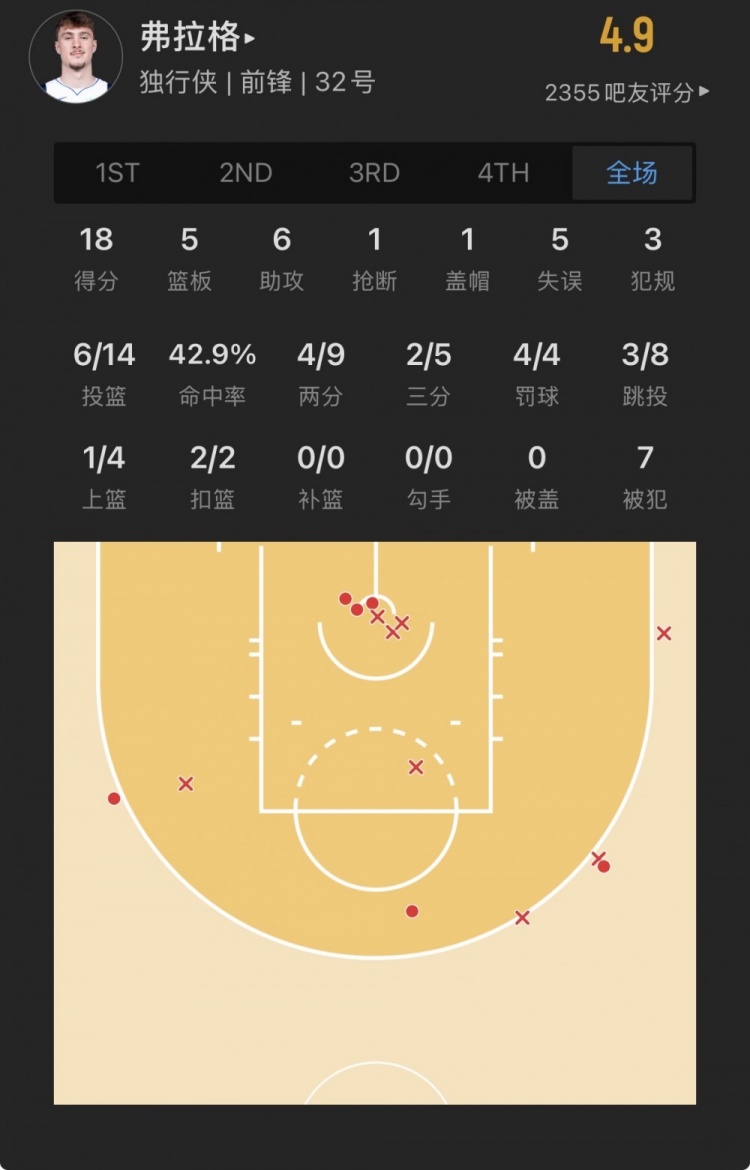 独行侠状元秀 库珀-弗拉格 登场34.7分钟