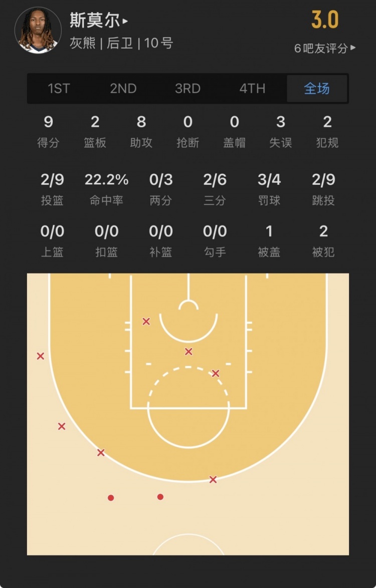 灰熊48号秀 贾冯-斯莫尔 登场22.0分钟