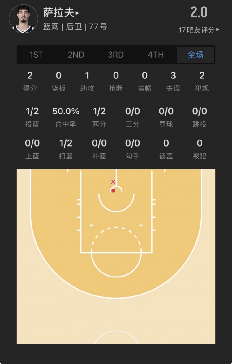 篮网26号秀 本-萨拉夫 登场18.5分钟
