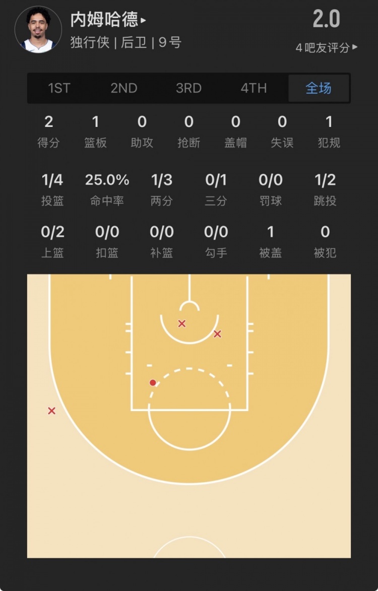 独行侠落选秀 瑞安-内姆哈德 登场9.8分钟
