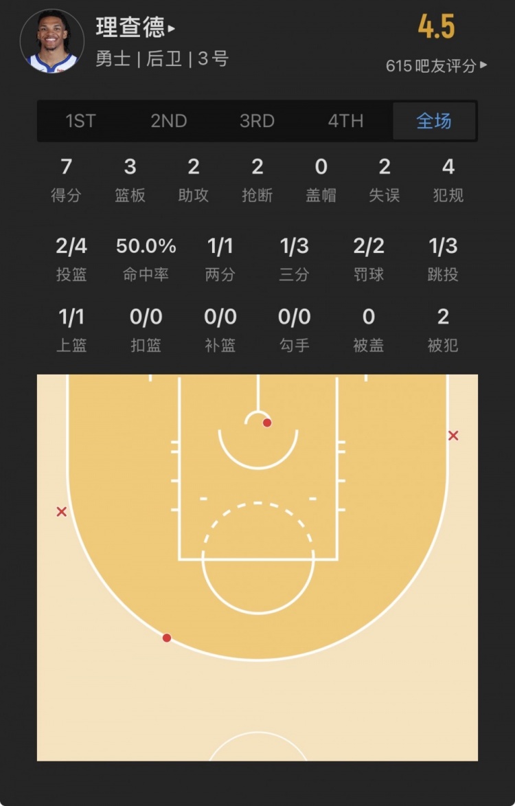 勇士56号秀 威尔-理查德 登场24.6分钟