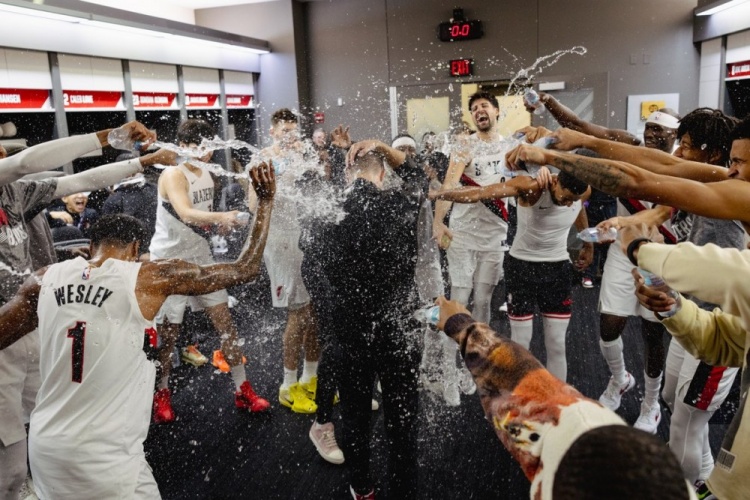 足球比分网10月25日讯 今日NBA常规赛,开拓者主场139-119大胜勇士斩获赛季首胜,同时也是临时主帅斯普利特执教生涯的首胜。 赛后斯普利特在更衣室被泼水庆祝,还拿到了比赛用球。