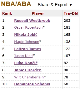 本场赛前三双榜 约基奇生涯至今共获得166次三双,暂列历史第三。前两位分别是威少(203次)和大O(181次)。 |