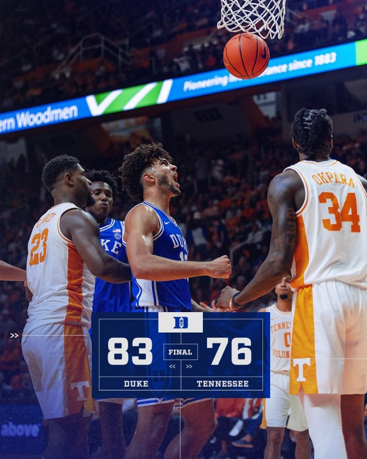 足球比分网10月27日讯 NCAA季前赛,杜克大学以83-76战胜田纳西大学。 此役,明年状元候选、杜克大学前锋卡梅隆-布泽尔表现优异,打出了双20的数据,还在比赛中送出了一记炸裂的抓帽。
