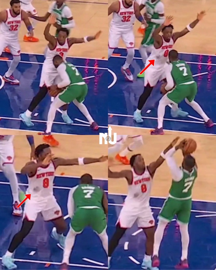 足球比分网10月29日讯 凯尔特人球员杰伦-布朗遭遇了“发际线危机”,本赛季至今已经多次将自己的发际线粉蹭到对手球衣上。 GIF-杰伦将发际线粉蹭了阿努诺比一身