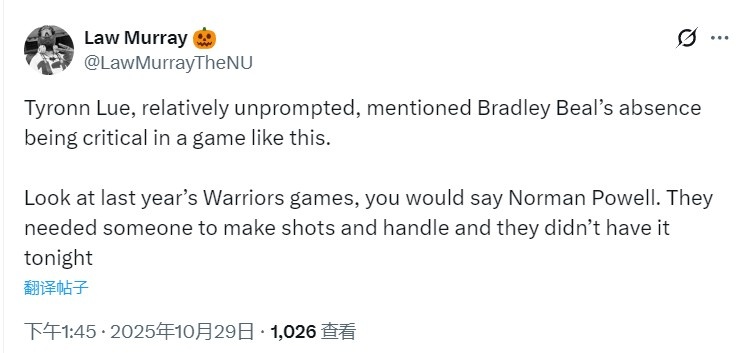 足球比分网10月29日讯 NBA常规赛,快船客场79比98不敌勇士。赛后快船主帅泰伦-卢接受了媒体的采访。 快船记者Law Murray报道,在采访中,卢不经意间提到比尔的缺阵对这样的比赛很关键。