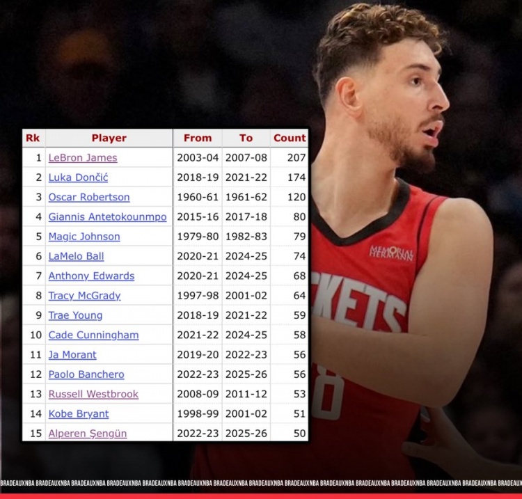 申京是NBA历史上完成50次20+5+5第15年轻的球员 最年