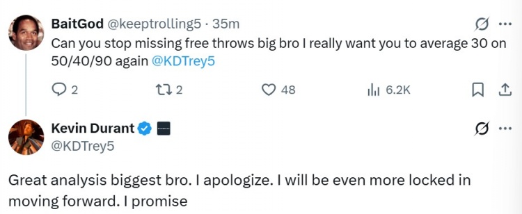 网友:希望KD别再丢罚球&场均30+180 后者:我道歉