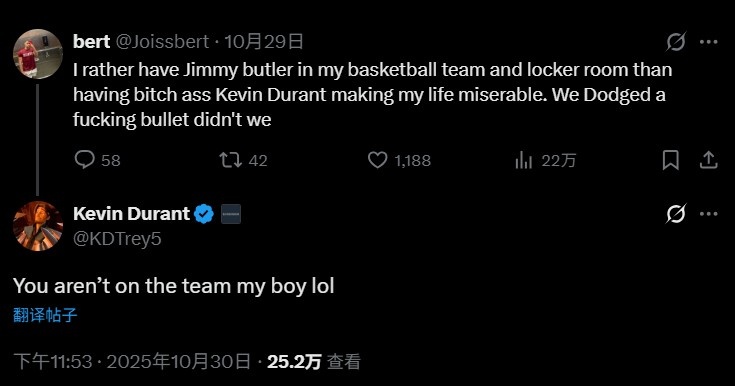 键来+1!网友称宁愿要巴特勒也不要KD 后者:你都