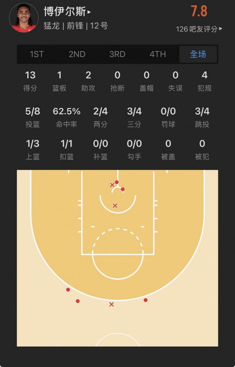 猛龙9号秀 科林-穆雷-博伊尔斯 登场25.3分钟