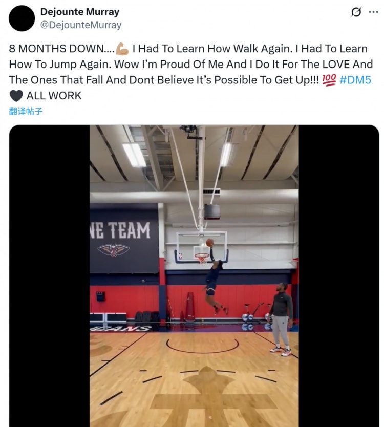 已能空接暴扣!德章泰-穆雷:8个月的努力 我一 时间: 2025-10-31 来源: 网络 作者: admin 足球比分网10月31日讯 今天遭遇跟腱断裂的鹈鹕球员德章泰-穆雷更新推特,他一段自己转身空接暴扣的视频,并写道:8个月的努力 上一篇:拉拉维亚11中10!森林狼球迷大喊12号是谁?华子 下一篇:裁判在跟前啊!小瓦被吹回场现白人问号脸 明显