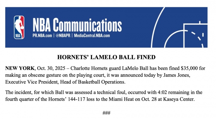 NBA官方:拉梅洛-鲍尔对裁判比不文明手势 被罚